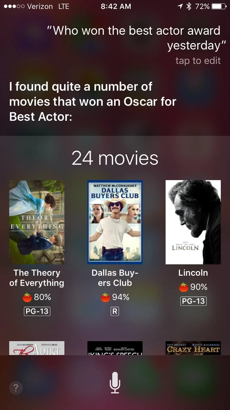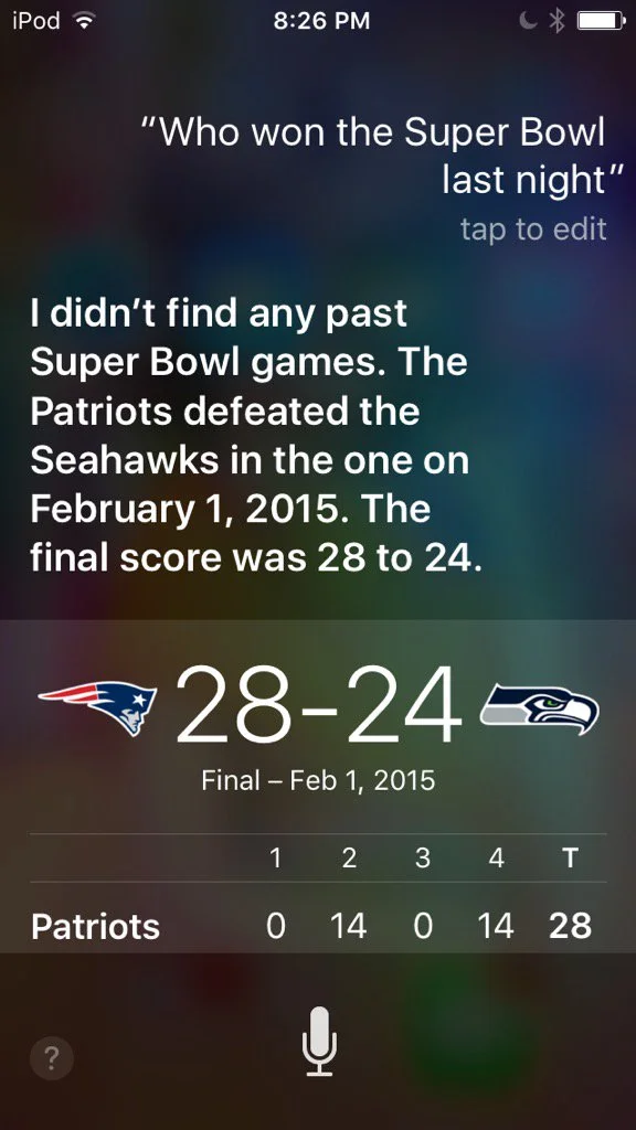 Consider two recent examples - Today Siri couldn't tell me who won the best actor award at the Oscars last night. The day after the 50th Super Bowl, Siri couldn't tell me who won the Super Bowl. In contrast - a google search last night during the Oscars was already showing me results related to the event that was unfolding in real time!